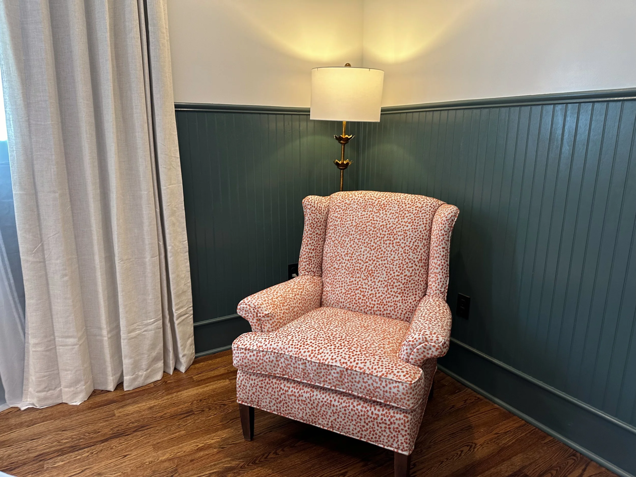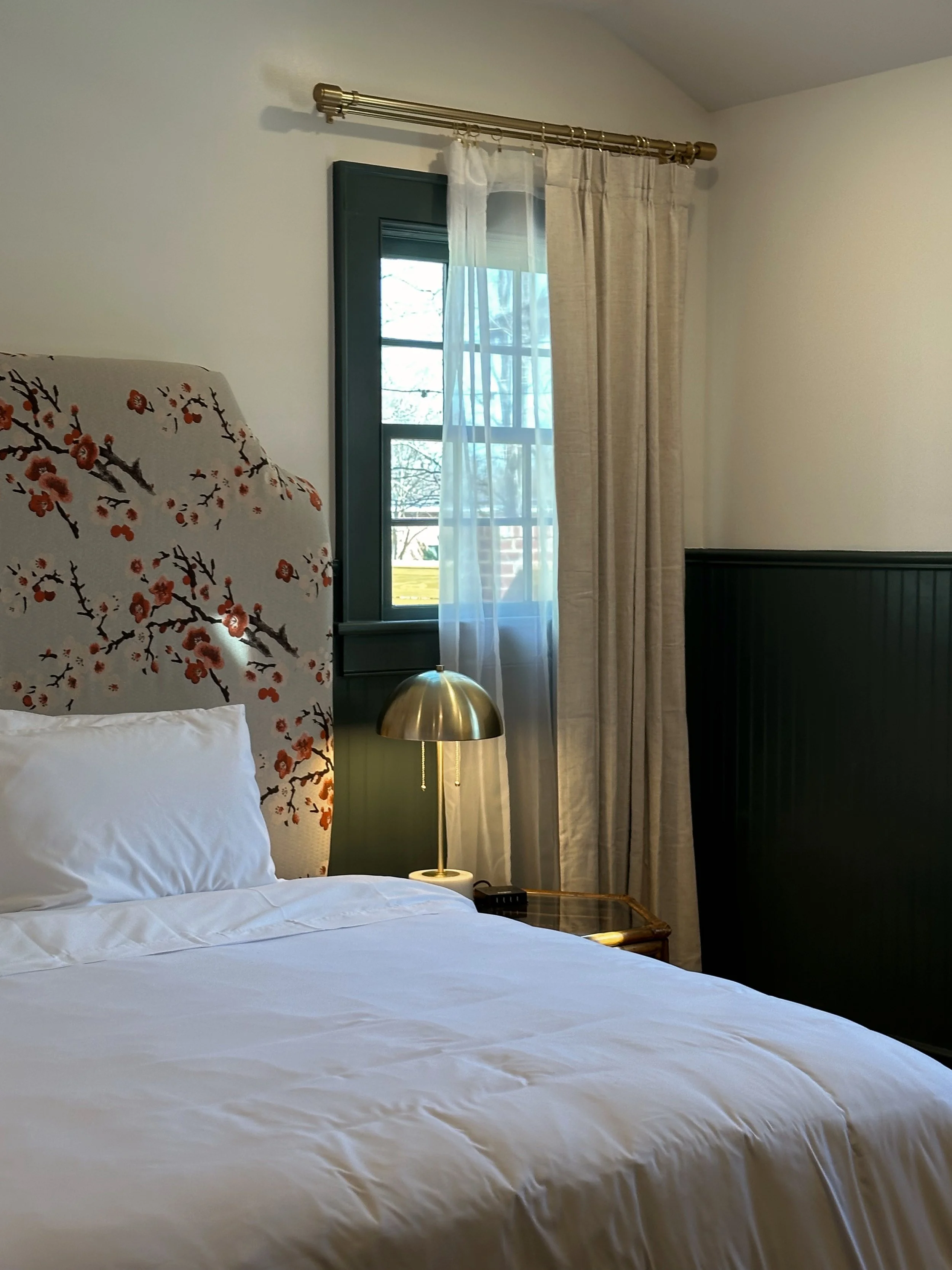 The Garden Room is one of the three suites located off the first floor hall. With windows overlooking the intimate patio, this room also includes a king bed with a custom upholstered headboard. The ensuite bathroom has a double vanity, walk in shower with a rain shower head. It is decorated in a mixture of historic and modern elements that are inspired by the beauty of nature. This suite is reminiscent of the feeling of walking into a courtyard garden that is both luxurious and peaceful.